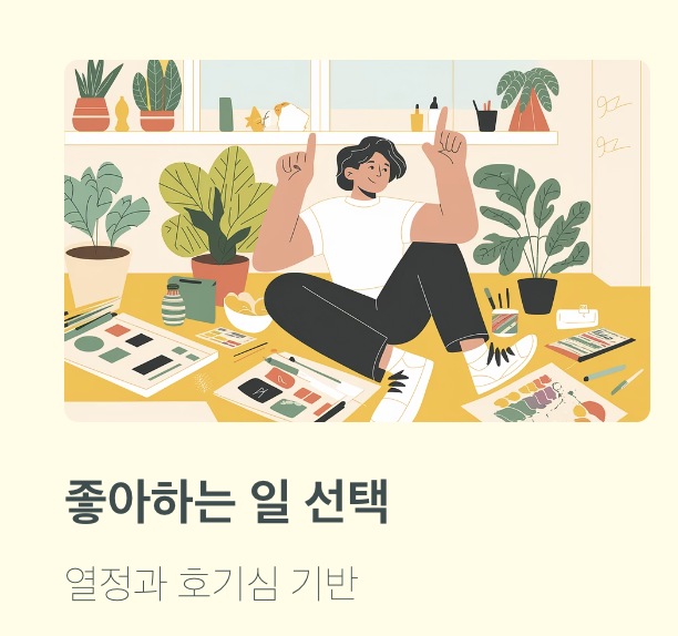 아직 내가 뭘 좋아하는지, 뭘 잘하는지 모르는 분들은 우선 시간을 가지세요. 여러분의 알고리즘, 유튜브 추천 영상, 인스타 탐색 탭, 그리고 서점에서의 발걸음이 말해주는 호기심의 방향을 주의 깊게 살펴보세요. 그리고 다양한 경험을 통해 나만의 관심사를 넓혀가시길 추천드립니다.